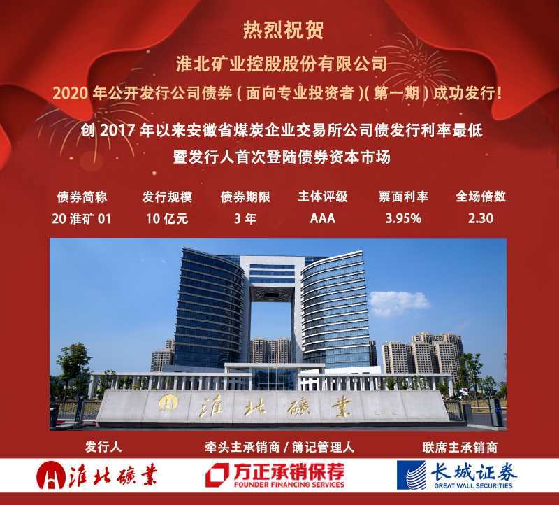 10月20日,淮北礦業2020年公開發行公司債(面向專業投資者)(第一期)成功發行,本期債券發行規模10億元,期限3年,票面利率3.95%,認購倍數2.3倍。