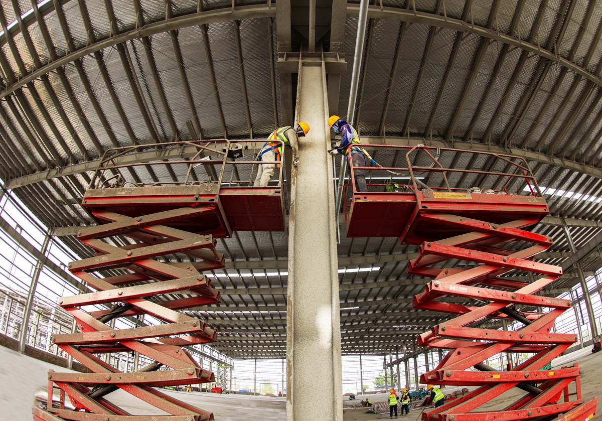 5月11日,工人借助升降車對廣聚物流園區(qū)廠房鋼結(jié)構(gòu)進(jìn)行防火涂層施工