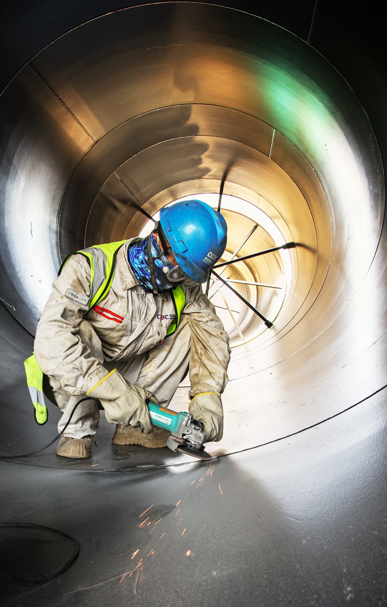5月13日,在聚能發(fā)電公司施工現(xiàn)場,工人對循環(huán)水管焊縫進(jìn)行拋光處理
