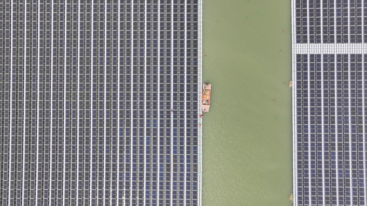 5月11日,電力分公司青東塌陷區(qū)水面光伏板正在組裝下水