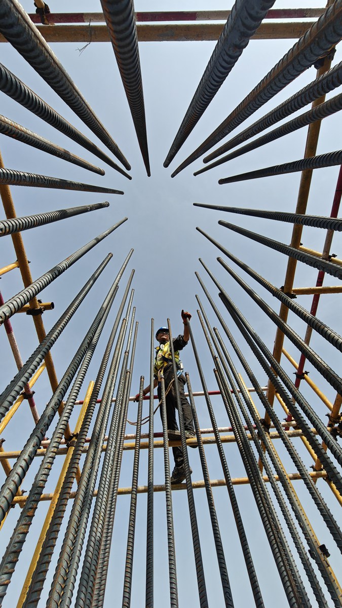 5月13日,工人在聚能發(fā)電公司機組項目建設(shè)現(xiàn)場綁扎鋼筋