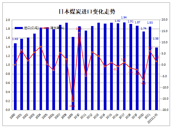 據日本財務省(Ministry of Finance Japan)發布的海關商品進出口貿易統計數據顯示,2022年1-8月,日本煤炭進口量累計為1.38億噸,比上年同期增加203.0萬噸,同比增長1.5%。其中,9月份煤炭進口1491.9萬噸,同比減少8.9%,環比下降14.0%。